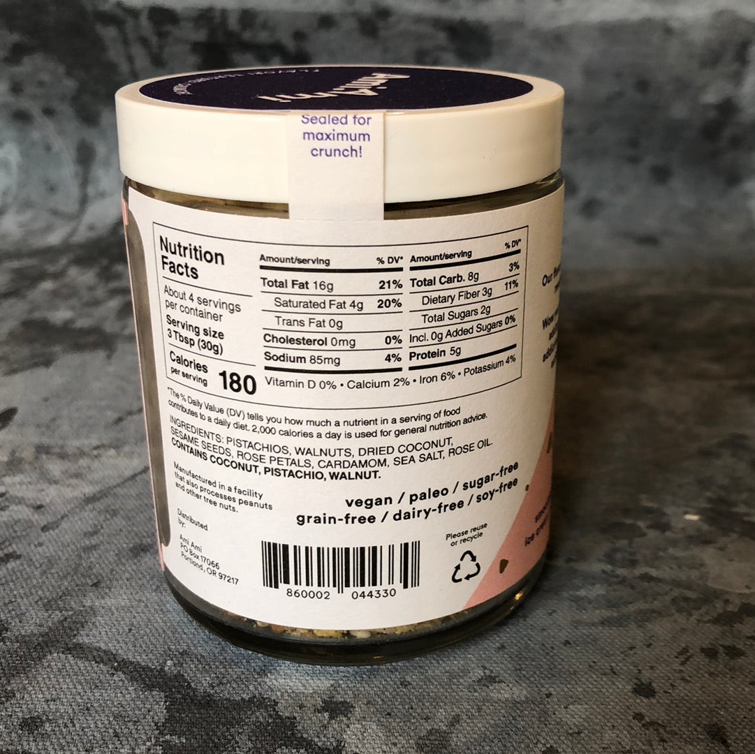 An aromatic blend of pistachio, rose, walnut, sesame, coconut and cardamom. Sprinkle it generously on all your faves! Smoothies, pancakes, ice cream, yogurt, baked goods and anything else your heart desires.