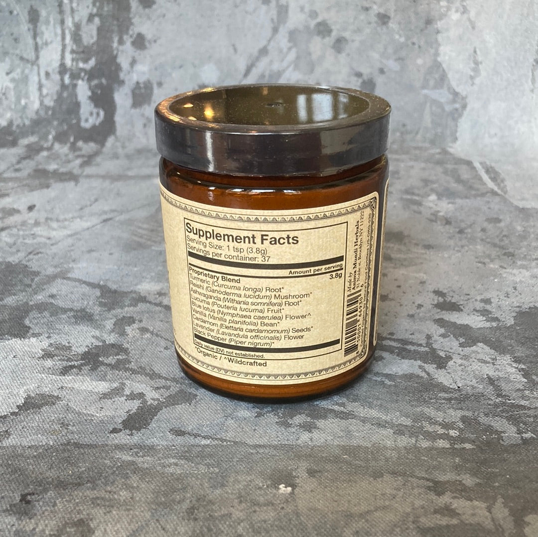 Our Golden Moon Milk contains relaxing plants, such as Ashwagandha, along with restorative 'spirit' plants such as Reishi, and Blue Lotus. It contains essential digestive herbs that assist relaxation such as lavender, cardamom, and vanilla. Our 100% organic vanilla is absolutely divine. Did you know that vanilla was used to decompress the nervous system back in the day in Europe? Yes, its a relaxing medicine too!