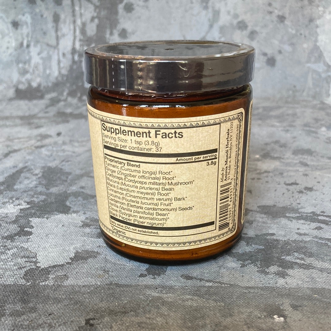 Our Golden Sun Milk contains activating plants, such as adaptogenic powerhouse Maca and Cordyceps, known to energize the body, and even increase muscle mass (Cordyceps!) Along with Mucuna, a revered nootropic also called "dopamine bean" due to its ability to enhance our dopamine receptors. Along with delicious and organic chai spices such as Cinnamon, Cardamom, Black Pepper, and Vanilla.