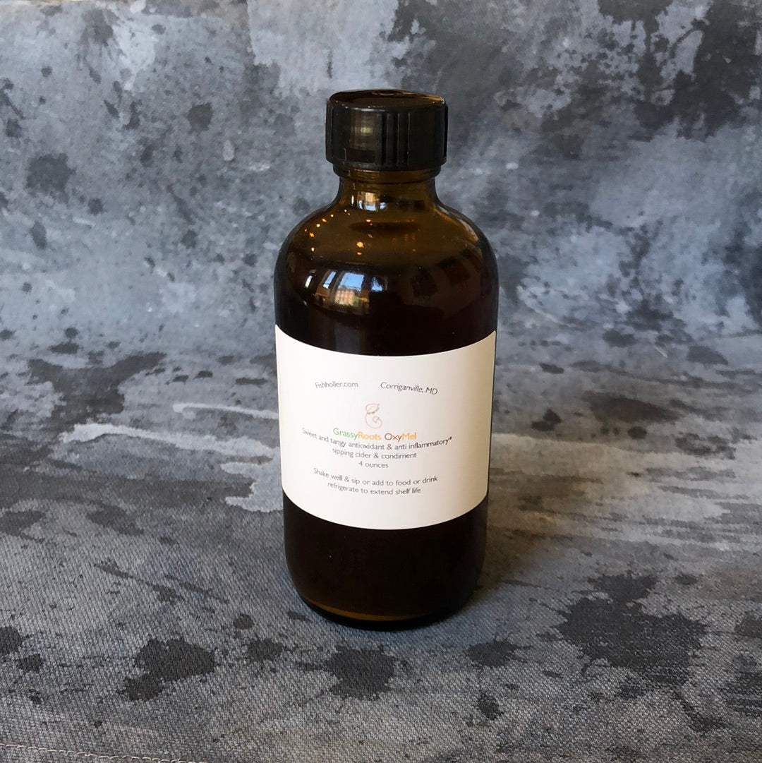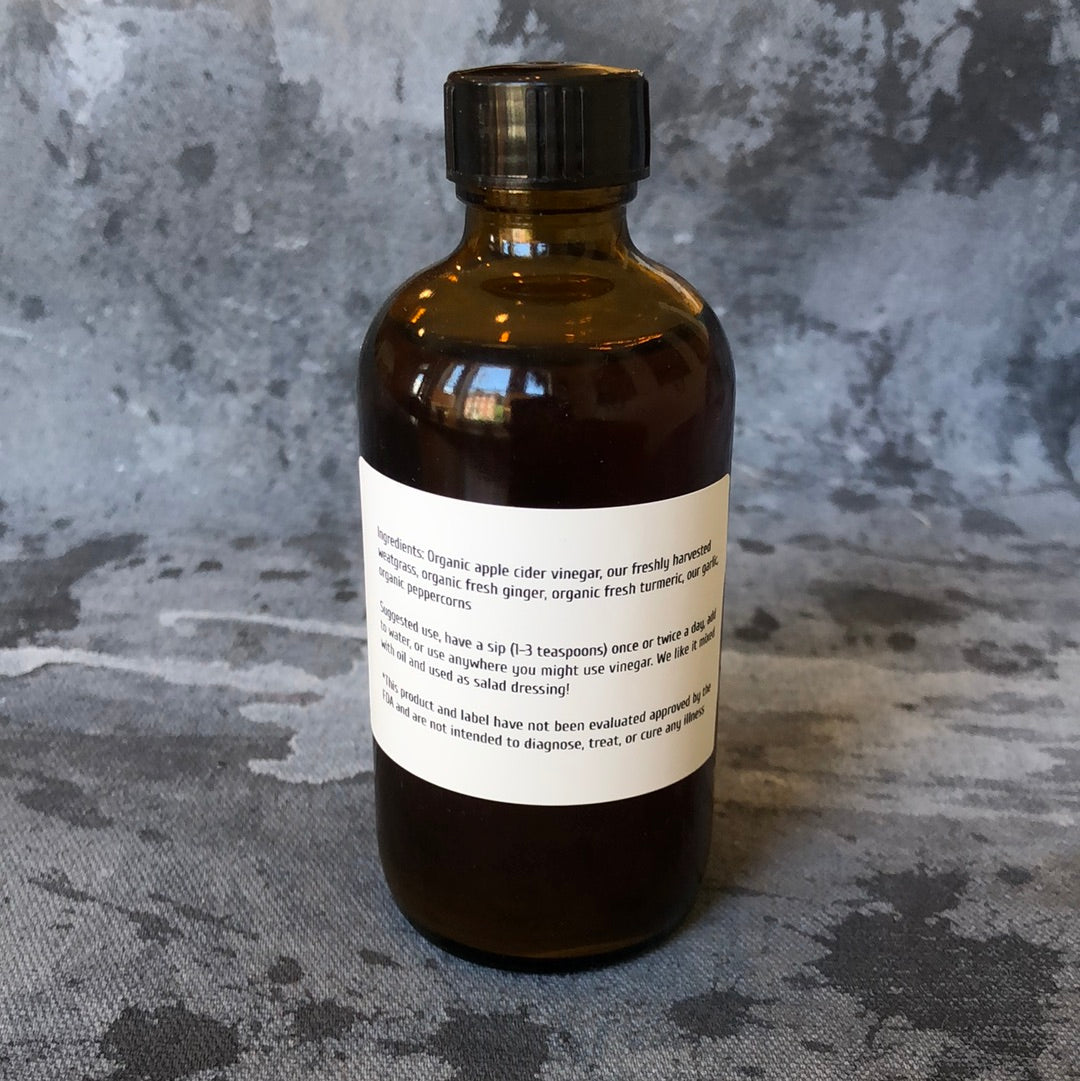 Simple and delicious. Organic apple cider vinegar, local honey, our freshly harvested wheatgrass, certified organic ginger root, farm fresh turmeric (thanks Hana Yoder!), our garlic, and certified organic peppercorn.